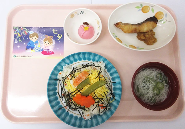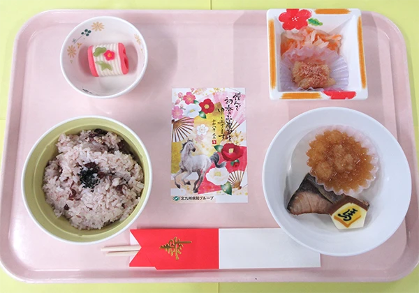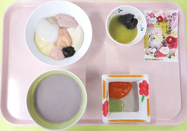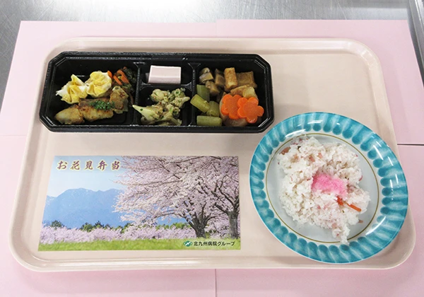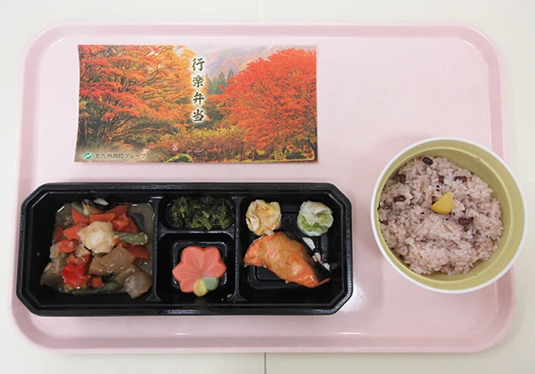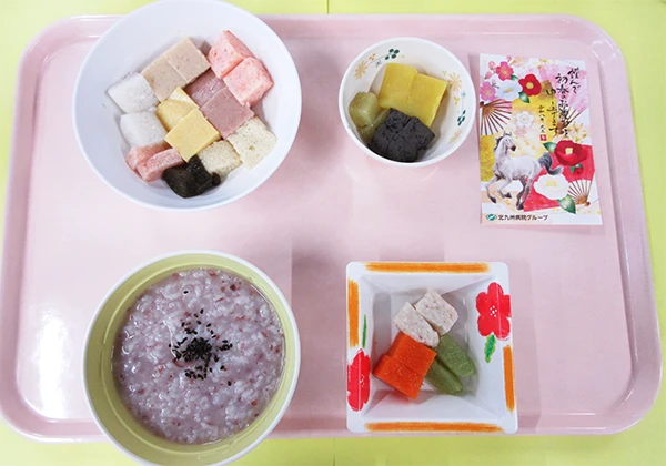 また、患者さんの摂取量に応じて提供量の調節をしています。行事食は年間16回程度実施し、ランチョンマットを添え、四季折々の季節感を食事から感じていただけるように努めています。