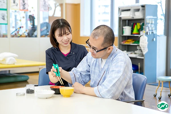 身体障害をあつかう療法と精神障害をあつかう療法に分類されます。当院では主に身体障害をあつかう作業療法を行っています。その役割は基本動作能力、応用動作能力、社会適応能力の維持・向上、環境資源の調整と指導です。環境資源の調整と指導では、住宅改修などの環境調整や自助具・装具などの作成と適合訓練、家事指導を行います。