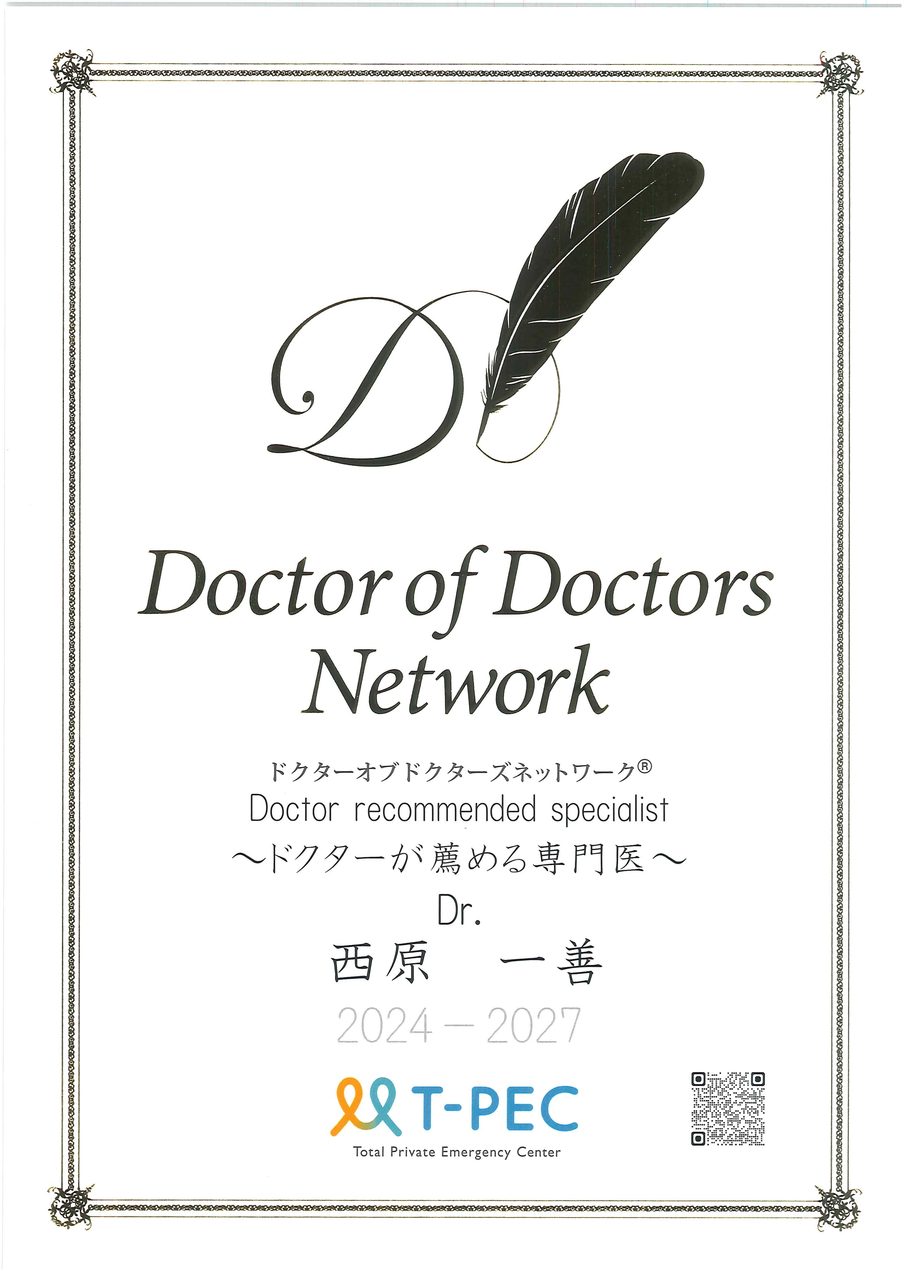 本認定は、医師同士の推薦により選出される制度であり、専門性の高さに加え、患者さまに寄り添う姿勢や信頼性などが総合的に評価されるものです。